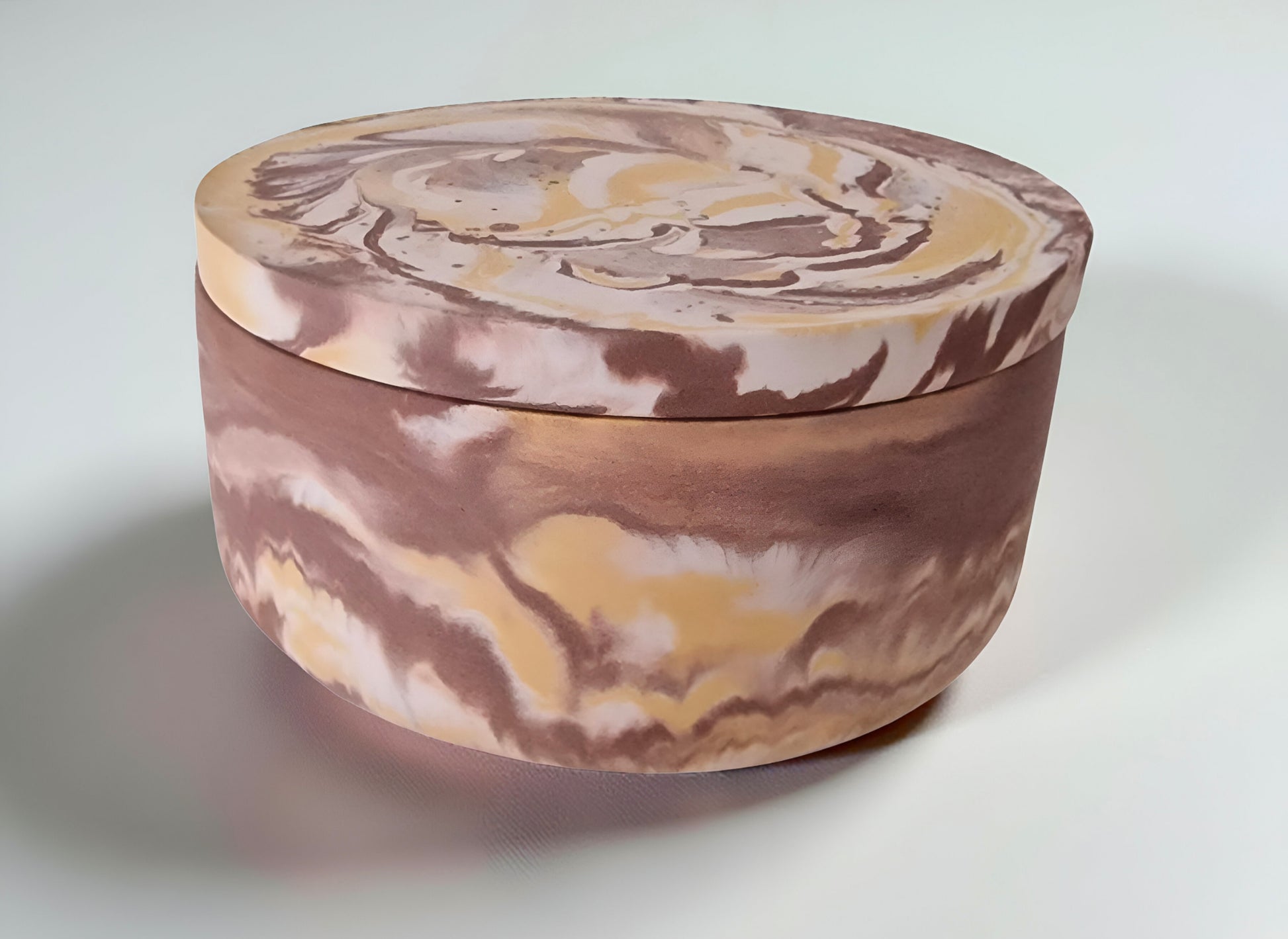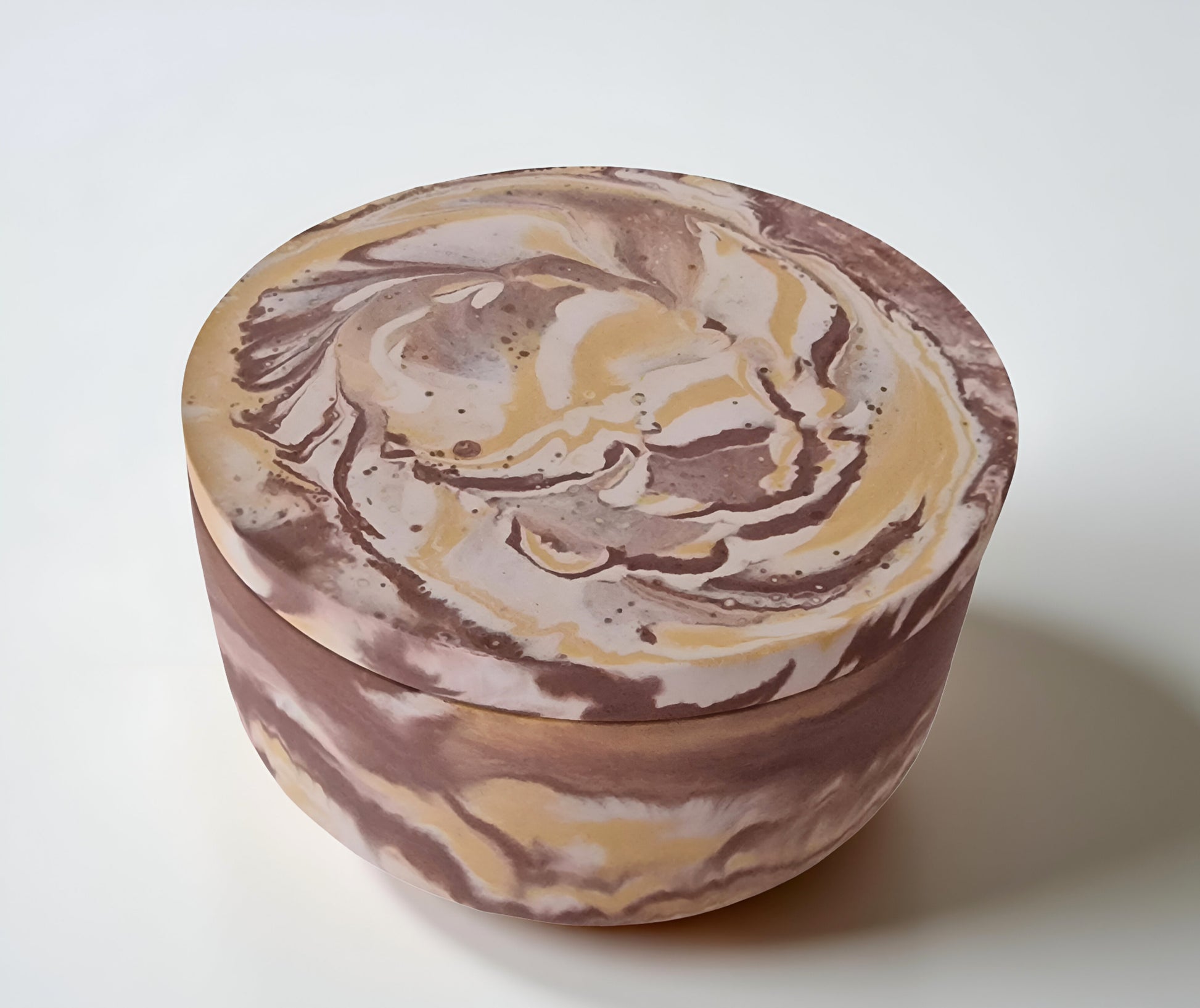 Diese handgefertigte Dekoschale überzeugt durch ihre sanfte Marmorierung in warmen Naturtönen. Sie wird inklusive passendem Deckel geliefert und eignet sich perfekt um kleine Dekoobjekte, Schmuck oder saisonale Arrangements stilvoll zu präsentieren.
