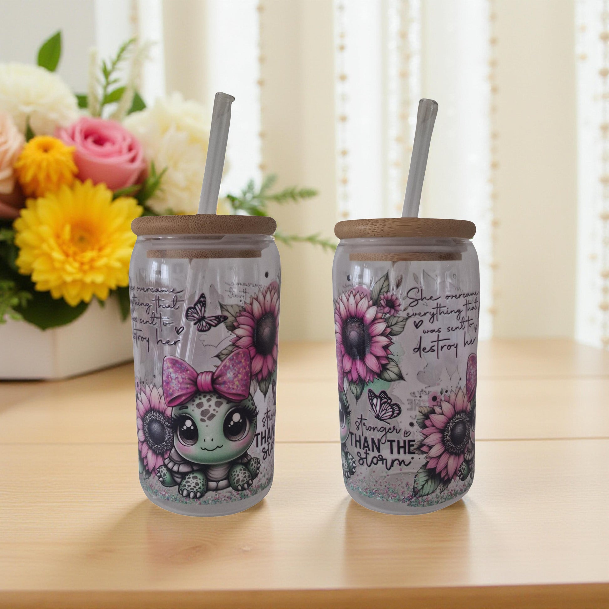 Dieses dekorative Trinkglas mit Schildkrötenmotiv ist ein echter Hingucker! Der Bambusdeckel schützt zuverlässig, und der Glasstrohhalm sorgt für entspanntes Trinken unterwegs oder zuhause. Perfekt für den Alltag oder als kleines, besonderes Geschenk.